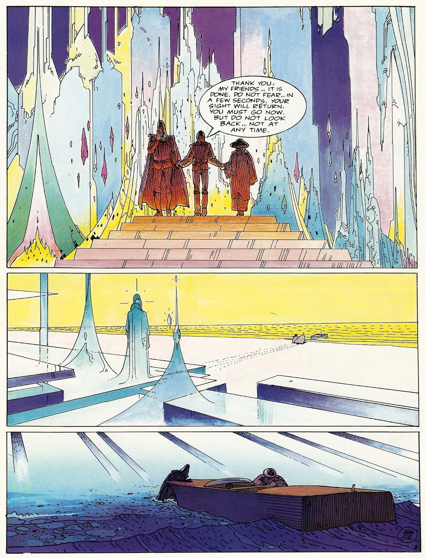 The entire iconography of the magical world of Kimitachi wa dō ikiru ka borrows from Moebius's Celestial Venice, while also drawing on the Moebius-inspired aesthetics of Kaze no tani no Nausicaä and Tenkū no shiro. From this perspective, the film is never divided into two distinct parts: it is a single meditation on an entire cultural production. Kimitachi wa dō ikiru ka is like a long hallucination or an improvised story – for Miyazaki's grandson – using imaginary material as a convenient framework to tell Mahito's story, just as Koperu in the novel of the same name uses his diary to explore his place in the world and how he can live in it. To a degree, Miyazaki takes on the role of both the great-uncle and Mahito, answering to himself and acknowledging his heritage while letting it soar.