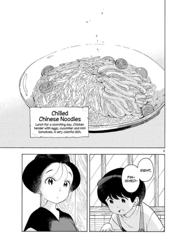 The food itself is drawn with care. Like the kitchenware, I imagine the mangaka made the meals themself and drew from that. Some chapters you get to see the progress Kiyo goes through. That effort of skill and attentiveness is evident. The manga turns into a visual cookbook, almost to give you no excuse to not make these meals yourself.