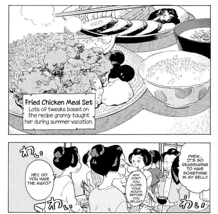 But don't let this fool you into thinking the manga is only about food. It shows a lot about becoming an adult and finding your own path in life. As stated in the early chapters, Kiyo actually came with her friend to become a Maiko. While her friend became an amazing Maiko, she did not and ended up becoming the main cook for all the Maiko. But it's not a sad thing for Kiyo, in fact, she's very happy with her life. She found her own path, even if it's not her original goal.